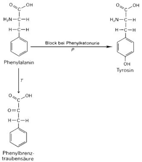 Bildung von Phenylbrenztraubensäure aus Phenylalanin bei genetischer Blockierung des Abbaus von Phenylalanin zu Tyrosin (Vorliegen von Phenylketonurie).