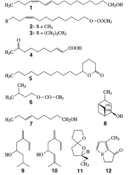 Zur Auftrennung der meist als Gemische vorkommenden Komponenten von Pheromonen dienen chromatographische Methoden, insbesondere die Gaschromatographie und HPLC. Die Pheromone werden oft aus sekundären Stoffwechselprodukten der von den Tieren aufgesuchten Wirtspflanzen gebildet. – Als Vorläufer der nicht-isoprenoiden Verbindungen werden meist Fettsäuren angenommen. Zu dieser Gruppe gehören z.B. die meisten Sexualpheromone der weiblichen Nachtschmetterlinge, so das Bombykol(1) und das Bombykal des Maulbeerseidenspinners (Bombyx mori), das (Z)-9-Dodecenylacetat (2) des Traubenwicklers Parolobesia viteana oder das (Z)-9-Tetradecenylacetat (3), eine Komponente des Sexualpheromons der Eulenfalter-Arten Spodoptera frugiperda und Prodenia eridanis. Bei einigen Verbindungen dieser Gruppe, z.B. dem Bombykol, genügen oft schon wenige Moleküle, um beim Männchen eine Reaktion auszulösen. Aus Extrakten der Königinsubstanz der Honigbiene (Apis mellifera), deren Verfütterung an Arbeiterinnen die Entwicklung eines neuen Königspaares verhindert, konnte (E)-9-Oxo-2-decensäure (4) als wirksames Pheromon isoliert werden. Diese Verbindung wurde auch aus anderen Bienen isoliert. Als Königinsubstanz der Hornisse konnte γ-Hexadecalacton (5) identifiziert werden. Der Geruch des abgebrochenen Stachels der Honigbiene lockt andere Bienen an. Dieses „Stachelpheromon“ konnte als Isopentylacetat (6) identifiziert werden. Bei dem Sexualpheromon der Stubenfliege (Musca domestica) handelt es sich um (Z)-9-Tricosen (7). Wegen des großen volkswirtschaftlichen Schadens, den diese Insekten anrichten, sind die Pheromone der Borkenkäfer (Scolytidae) recht intensiv untersucht worden. Als Lockstoff des Borkenkäfers Ips paraconfusus konnte eine Kombination von Monoterpenalkoholen identifiziert werden, die aus (+)-cis-Verbenol(8), 2-Methyl-6-methylen-7-octen-4-ol (Ipsenol; 9) und (+)-2-Methyl-6-methylen-2,7-octadien-4-ol (Ipsdienol; 10) besteht. Das Aggregationspheromon des Fichtenborkenkäfers (Ips typographus) konnte als das Diastereomerengemisch des 2-Ethyl-1,6-dioxaspiro[4.4]nonan (Chalcogran; 11) identifiziert werden. – Ungewöhnlich sind stickstoffhaltige Pheromone. Derartige Verbindungen wie das Danaidon(12), deren Vorläufer allerdings von alkaloidführenden Pflanzen aufgenommen werden, kommen in Schmetterlingen aus der Familie Danaidae vor.