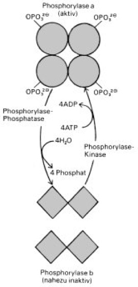 Die beiden Enzyme Phosphorylase-Kinase und Phosphorylase-Phosphatase werden ihrerseits durch die Stoffwechsellage der Zelle im Verhältnis der Konzentrationen von ADP und ATP (durch das cAMP) gesteuert, dazu aber noch von außen her, durch den Einfluß von Hormonen.