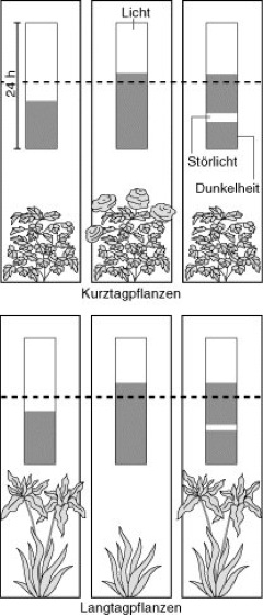 Photoperiodismusm [von *photo- , griech. periodos = Umlauf, Wiederkehr], Abhängigkeit des Wachstums, der Entwicklung und des Verhaltens von Pflanzen und Tieren von bestimmten Tages- bzw. Nachtlängen (Lichtfaktor, Chronobiologie [Tab.]). Tiere sind durch ihre Fähigkeit, die Tageslänge (Photoperiode) und somit auch die Jahreszeit zu „bestimmen“, z.B. in der Lage, Winterschlaf, Fellwechsel (Haarwechsel), Wanderungen (z.B. jahresperiodische Zugaktivität bei Vögeln; Vogelzug) oder ihre Fortpflanzung an den Jahresgang anzupassen ( vgl. Infobox ). Durch die Länge der täglichen Beleuchtungsdauer (Photoperiode) gesteuerte Reaktionen besitzen eine genetisch determinierte, kritische Tageslänge, die über Ablauf oder Hemmung der Reaktion entscheidet. Tageslängen unterhalb der kritischen Tageslänge heißen Kurztag, oberhalb derselben Langtag. Bei der photoperiodischen Steuerung der Blütenbildung unterscheidet man z.B. zwischen Kurztagpflanzen und Langtagpflanzen ( vgl. Infobox , vgl. Abb. 1 und vgl. Abb. 2 ). Grundlage der photoperiodischen Steuerung ist das Zusammenwirken von Photorezeptoren (Phytochrom-System, Blaulichtrezeptor) mit einem endogenen Zeitmeßvorgang, der circadianen Rhythmik oder physiologischen Uhr. Pflanzen tropischer Herkunft sind oft tagesneutral (tagneutrale Pflanzen), zeigen also keinen Photoperiodismus. Ein einziger Lichtblitz in der Nacht genügt, um der Pflanze einen „Langtag“ vorzuspiegeln. Dies wird technisch genutzt, um den Blühzeitpunkt von Gewächshausblumen energiesparend exakt zu steuern (Blühinduktion). Chronobiologie (Farbtafel), Dämmerung, Jahreszyklen.