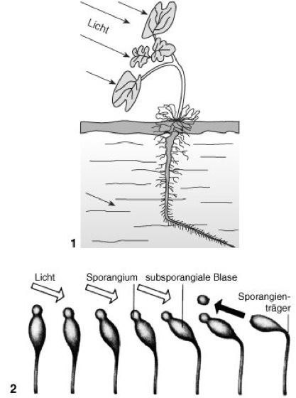 2 Phototrope Reaktion der Sporangienträger des Jochpilzes Pilobolus („Pillenwerfer“): Die Sporangienträger erheben sich bis zu 5 cm über das Substrat. Bei Sporenreife schwillt der obere Teil des Sporangienträgers unterhalb des Sporangiums an. Gleichzeitig krümmt sich dieser Teil des Sporangienträgers in Richtung des einfallenden Lichts (Wachstumsreaktion). Die angeschwollene Blase platzt (Explosionsmechanismen) und schleudert die Sporenmasse bis über 1 m in Richtung des einfallenden Lichts ab.