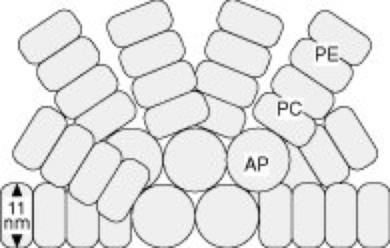 Schematische Darstellung eines Phycobilisoms, in dessen Zentrum Allophycocyanin (AP) liegt, über dem sich die anderen Phycobiliproteine befinden. PC = Phycocyanin, PE = Phycoerythrin