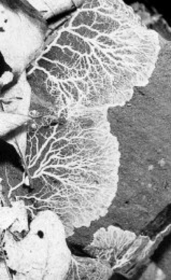 Blasenstäubling (Physarum) bei der Ausbreitung über einen Felsen