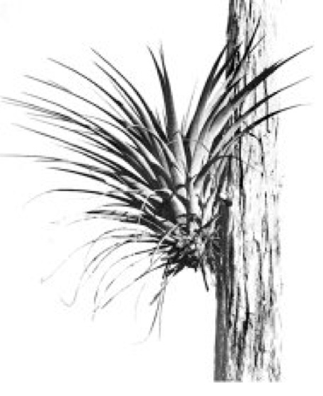 Bromeliengewächs auf einem Baumstamm; Bromelien sammeln in trichterförmigen Vertiefungen am Grunde ihrer Blätter das Niederschlagswasser.
