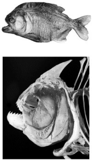 Pirayas [aus der Indianersprache Tupí-Guaraní], Piranhas, Serrasalmus, aus knapp 20 Arten bestehende Gattung der Scheiben- oder Säge-Salmler in südamerikanischen, tropischen Gewässern; haben große, dreieckige, in Reihen angeordnete, sehr scharfe Zähne in kräftigen Kiefern, seitlich abgeflachten, hochrückigen Körper mit langgestreckter Rückenflosse, Fettflosse und sägeartigen Bauchkiel aus Schuppen vor der großen Afterflosse. Hierzu der Piraya (Serrasalmus piraya; vgl. Abb. und vgl. Fische XII ) und Natterers Sägesalmler (Serrasalmus nattereri), die bis ca. 30 cm lang werden und vor allem im Orinoko- und Amazonasgebiet vorkommen; sie fressen vorwiegend verletzte Fische, greifen bei dichter Besiedlung aber auch große Säugetiere mit offenen Wunden (sogar Menschen) an; viele durch den Blutgeruch angelockte Pirayas können die Beute innerhalb weniger Minuten völlig skelettieren.