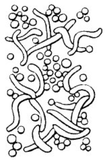 Sproßzellen und gekrümmte Fäden von Pityrosporum ovale (Malassezia furfur)