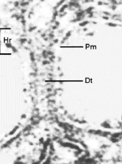 Feinstruktur von Plasmodesmen (elektronenmikroskopische Aufnahme). Dt Desmotubulus, Hr Halsregion, Pm Plasmamembran.
