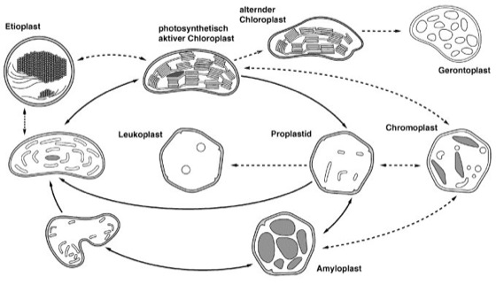 Abb. 1: Die unterschiedlichen Plastiden-Typen können teilweise auseinander hervorgehen. In der Abb. zeigen durchgezogene Pfeile den normalen Gang der Plastidenentwicklung, gestrichelte Pfeile verdeutlichen Entwicklungen, die durch Umwelteinflüsse hervorgerufen werden.