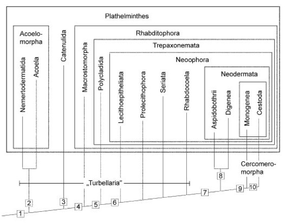 Phylogenetischer Stammbaum der Plathelminthes. Apomorphien: [1] Ersatz von Geweben während Entwicklung, Wachstum und Regeneration durch Stammzellen (Neoblasten). [2] Fast immer lumenloses Darmsystem. [3] Dorsales, unpaares Protonephridialsystem, bestehend aus einem am Hinterende beginnenden und dort ausmündenden Protonephridialkanal, der bis über das Gehirn nach vorne reicht und seitlich Terminalorgane mit einer zweigeißeligen Cyrtocyte und einer Kanalzelle trägt. [4] Echte Rhabditen. [5] Flagellen-Axonem in den zweigeißeligen Spermien mit einem 9×2+1-Muster. [6] Ektolecithale Eier und heterozelluläre weibliche Gonade (Germarium, Vitellarium oder Ovovitellarium). [7] Abwurf der larvalen, bewimperten Epidermis beim Eindringen in den 1. Wirt. Aufbau einer sekundären Neodermis durch Neoblasten aus dem Parenchym. Reuse der Protonephridien aus Terminalzelle und 1. Kanalzelle aufgebaut. [8] Mollusk als 1. Wirt. Andere überzeugende Apomorphien sind nicht bekannt. [9] Mit sichelförmigen Häkchen am Hinterende. [10] Darm fehlt in allen Entwicklungsstadien. Verändert nach Westheide/Rieger 1996.