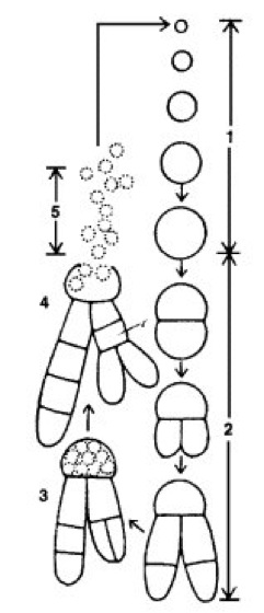 1 Baeocyten (Endosporen) wachsen heran; 2 es erfolgen mehrmals Zweiteilungen in verschiedenen Ebenen; 3 Vielteilungen in einigen Zellen; 4 Freisetzung der Baeocyten; 5 bewegliche Baeocyten