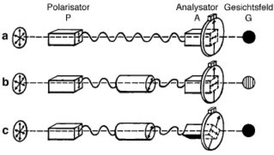 Der Polarisator P stellt aus nicht-polarisiertem Licht linear polarisiertes her. a Das Gesichtsfeld G bleibt dunkel, wenn der Analysator A senkrecht zur Polarisationsrichtung des ankommenden Lichts eingestellt ist. b Eine in den Strahlengang gebrachte optisch aktive Substanz dreht die Polarisationsebene: das Gesichtsfeld hellt sich auf. c Der zugehörige Drehwinkel läßt sich durch Nachdrehen des Analysators bis zur erneuten Auslöschung bestimmen.