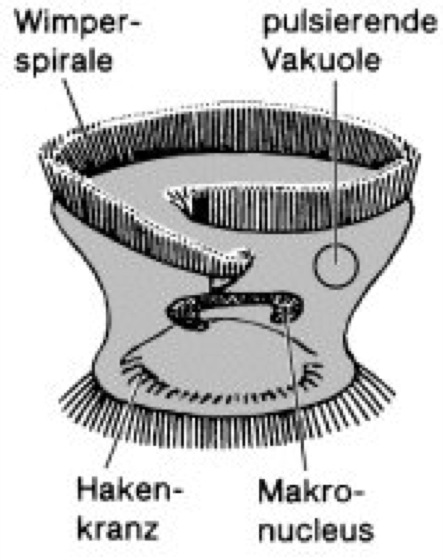 Polypenlaus, Trichodina pediculus, Wimpertierchen der Ordnung Peritricha (Unterordnung Mobilia); lebt an Süßwasserpolypen(Hydra); der Körper ist kurz und zylindrisch mit einem großen Mundfeld und runder, basaler Haftscheibe, die mit Membranellen und Cilien besetzt ist ( vgl. Abb. ). Trichodina domerguei ist parasitisch auf Fischen.