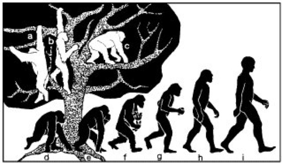 Stadien a–f von arboreal-bimanueller bis terrestrisch-bipeder Fortbewegung überspannt der heutige Schimpanse (Pan troglodytes) als Modell bislang nicht gefundener stammesgeschichtlicher Vorfahren des Menschen. Stadien g–h entsprechen Rekonstruktionen von Australopithecus (g) und Homo erectus (h).
