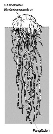 Portugiesische Galeere, Seeblase, Physalia physalis, Gattung der Staatsquallen; weltweit verbreitete, kompliziert gebaute Hydrozoenkolonie (Hydrozoa), die häufig in Schwärmen auftritt. Der Gründungspolyp wächst bis zu einer Größe von 30 cm heran und verwandelt sich in eine Gasflasche (vor allem Stickstoff, wenig Sauerstoff und Argon), die horizontal auf der Wasseroberfläche liegt. Ins Wasser hinein ragen 2 Reihen Cormidien, die Trophozoide (Nährpolypen), Gonophoren (bis zu 2400) und Fangfäden tragen ( vgl. Abb. ). Letztere können bis zu 50 m (!) lang sein und besitzen große Mengen von Nesselkapseln (Cniden) mit einem starken Nesselgift (Coelenteratentoxine). Mit dem Wind wird die Kolonie davongetrieben. Dabei zieht sie die Fangfäden wie einen Vorhang hinter sich her und fischt den Wasserraum ab. Es können auch große Fische überwältigt werden, die mit den sich zusammenziehenden Fangfäden zu den Freßpolypen hochgezogen werden. Die Giftwirkung der Portugiesischen Galeere ist selbst für den Menschen sehr stark und geht auch von abgerissenen Fäden aus, die häufig im Wasser driften. Es treten starke Schmerzen und Herz-Kreislauf-Schocks auf, die zum Tod führen können. Die Portugiesische Galeere ist blau gefärbt; die Gasflasche ist silbern mit einem leichten Purpurhauch. Anecta.