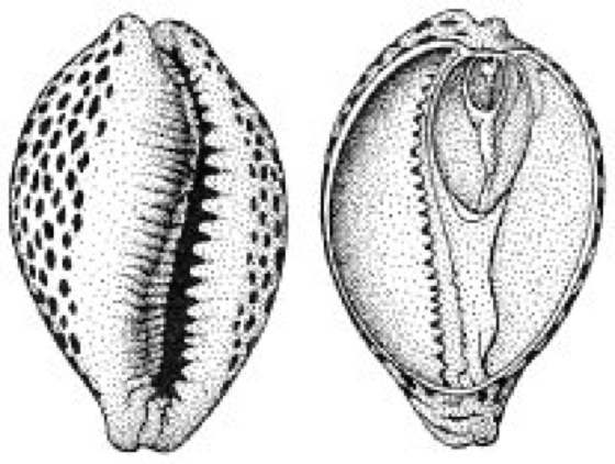 Porzellanschnecken, Kaurischnecken, Cypraeidae (Überfamilie Cypraeoidea), marine Mittelschnecken mit eiförmigem bis halbkugeligem Gehäuse ohne Deckel; das kurze Gewinde wird bei Adulten vom jüngsten Umgang umschlossen ( vgl. Abb. ). Die langgestreckte Mündung ist auf der Spindel- und der Außenseite gezähnelt und hat an beiden Enden eine Rinne. Mantellappen umschließen das Gehäuse und lagern ihm eine glänzend-glatte Porzellanschicht (Schmelzschicht) auf. Der Kopf trägt lange, fadenförmige Fühler mit Augen an der Außenbasis. In der Mantelhöhle liegen eine gebogene Kieme sowie ein meist dreistrahliges Osphradium und eine große Hypobranchialdrüse. Porzellanschnecken sind Bandzüngler ohne Kiefer und getrenntgeschlechtlich, oft mit Sexualdimorphismus. Die Eier werden in Kapseln an Hartsubstrat geklebt und von den Weibchen behütet. Porzellanschnecken sind meist nachtaktive Allesfresser in tropischen Flachmeeren und Korallenriffen. Die ca. 190 Arten werden entweder in der Großgattung Cypraea zusammengefaßt oder auf zahlreiche Gattungen verteilt, die im ersteren Falle nur als Untergattung gewertet werden. Die Porzellanschnecken sind attraktive Sammlerobjekte und daher sämtlich im Bestand gefährdet. Bekannt sind u.a. die Geldschnecke, Cypraea (Monetaria) moneta, und im Mittelmeer Cypraea (Luria) lurida mit bräunlichem, quergebändertem Gehäuse (6 cm hoch) und je 2 braunen Flecken oben und unten. Die Tigerschnecke, Cypraea (Cypraea) tigris (bis 15 cm hoch), trägt braune Flecken auf weißlichem Grund; sie lebt unter Korallen des Indopazifiks. Cypraea-Geld, Pustularia.