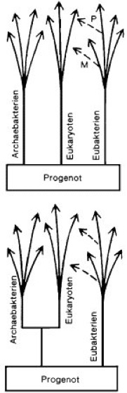 2 Modelle über die phylogenetische Beziehung zwischen Archaebakterien, Eubakterien und Eukaryoten, ausgehend von dem allen Organismenreichen gemeinsamen hypothetischen Vorfahren. M Mitochondrien, P Plastiden (Endosymbiontenhypothese).