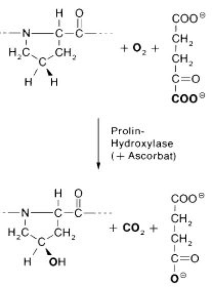 Prolin-Hydroxylasew, Prolyl-Hydroxylase, ein Enzym, das bestimmte, in Proteinen wie Kollagen enthaltene Prolin-Reste (nicht jedoch freies Prolin) zu 4-Hydroxy-Prolyl-Resten modifiziert ( vgl. Abb. ). Diese Modifizierung findet statt, lange bevor sich die helikalen Strukturen des Kollagens bilden. Das Enzym benutzt molekularen Sauerstoff als Elektronenakzeptor, wobei eines der beiden O-Atome auf das C4-Atom des Prolin-Restes, das andere obligat auf α-Ketoglutarat unter Entstehung von CO2 und Succinat übertragen wird. Die Prolin-Hydroxylase ist daher eine (intermolekulare) Dioxygenase. Das Enzym besitzt in seinem aktiven Zentrum ein für seine Funktion wichtiges Fe2+-Atom. Zur Erhaltung des Eisens in der zweiwertigen Form benötigt die Prolin-Hydroxylase daher Ascorbinsäure (Vitamin C) als Cofaktor, der entstehendes Fe3+ durch Abgabe eines Elektrons sofort wieder in den zweiwertigen, aktiven Zustand überführt (Lysyl-Hydroxylase).