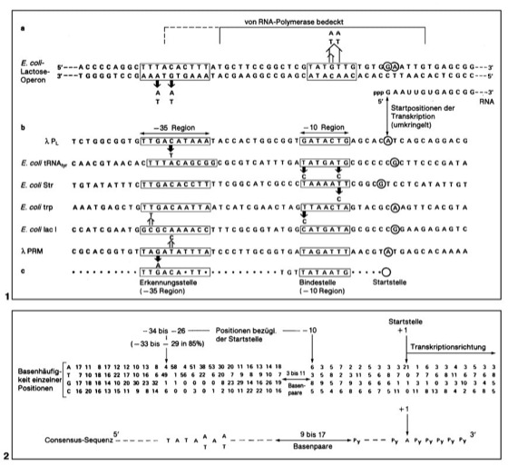 c Consensus-Sequenzen von Erkennungs- und Bindestellen. Dabei wurden alle bekannten Promotor-Sequenzen (nicht nur die in a und b aufgeführten) berücksichtigt.
