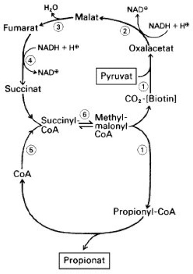 Beteiligte Enzyme: 1 Methylmalonyl-CoA-Carboxytransferase, 2 Malat-Dehydrogenase, 3 Fumarase, 4 Fumarat-Reductase (ATP-Bildung), 5 CoA-Transferase, 6 Methylmalonyl-CoA-Mutase