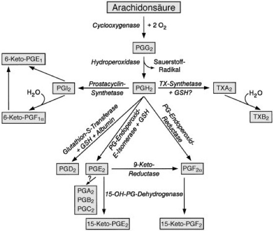PGG, PGH: Prostaglandinendoperoxide; PGI: Prostacyclin; TXA, TXB: Thromboxane