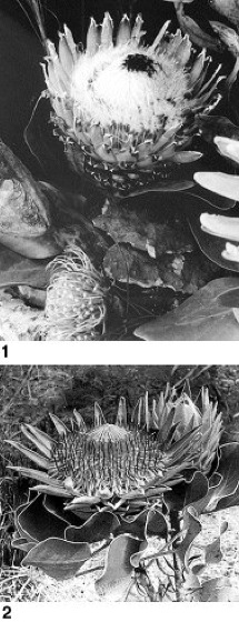 Blüte von 1Protea grandiceps, 2Protea cynaroides