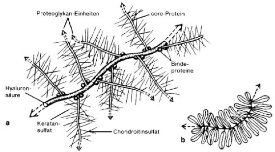 Das Schema a zeigt den Aufbau der Proteoglykane in der Knorpelmatrix. Die etwa 300 nm lange Polypeptidkette (core-Protein, relative Molekülmasse Mr = 250.000) macht weniger als 10% der Gesamtmasse des Moleküls aus, 90% entfallen auf die Polysaccharidseitenketten; unter diesen dominieren Ketten von Chondroitin- (Chondroitin) und Keratansulfat. Chondroitinsulfat (ca. 80 Ketten pro Proteoglykan-Einheit) ist ein unverzweigtes Heteroglykan (Mr = 20.000), in dem Glucuronsäure und sulfatierte N-Acetyl-D-Galactosaminreste abwechselnd hintereinander angeordnet sind. Die Keratansulfatketten sind kürzer; hier wechseln Galactosyl- und sulfatierte N-Acetyl-D-Glucosaminreste einander ab, und die Kettenenden tragen Sialinsäurereste. – Proteoglykane bilden Aggregate (b), die aus einem zentralen Hyaluronsäurestrang und zahlreichen (bis zu 100) seitlich abstehenden Proteoglykan-Einheiten aufgebaut sind. Die nicht kovalente Wechselwirkung zwischen dem core-Protein und dem Filament aus Hyaluronat wird von einem kleinen Protein (Bindeprotein, link-Protein) vermittelt. Diese Aggregate sind elastisch-flexibel und komprimierbar. Sie binden an bestimmte Banden der Kollagen-Fibrillen.