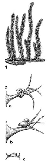 1Protolepidodendron scharianum. 2 Im Formenkreis um Protolepidodendron ist eine zunehmende Reduktion der Sporangienzahl pro Sporophyll erkennbar: aEstinnophyton, bProtolepidodendron wahnbachense, cProtolepidodendron scharianum