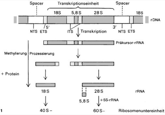 1 Schema der Prozessierung von rRNA bei Eukaryoten; dunkelgrau die transkribierten rDNA-Bereiche und die ihnen entsprechende rRNA, hellgrau die DNA der transkribierten Zwischenstücke und die ihnen entsprechende RNA. Im Zuge der Prozessierung wird nach und nach alle RNA entfernt, die den Zwischenstücken entspricht. Die zunächst freie 5,8S-rRNA wird sekundär über Wasserstoffbindungen an die 28S-rRNA angehängt. Daß zum Prozessieren auch die Methylierung der RNA und die Bildung von rRNA/Protein-Komplexen gehört, wurde nur angedeutet. ETS = externer transkribierter spacer, ITS = interner transkribierter spacer, NTS = nicht transkribierter spacer.
