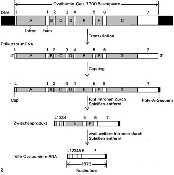 2 Schema eines Mosaikgens, des Gens für Eieralbumin (Ovalbumin), mit Prozessierung der an ihm gebildeten Präkursor-mRNA. Die Intronen und die ihnen entsprechende RNA sind dunkelgrau wiedergegeben; die Intron-RNA wird nach und nach entfernt.