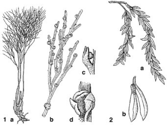 1Psilotum nudum: a Wuchsform, b Ausschnitt aus dem oberen fertilen Teil, c blattachselständiges junges und d reifes Synangium. 2Tmesipteris tannensis:a beblätterter Zweig, b Sporophyll mit 2fächrigem Synangium