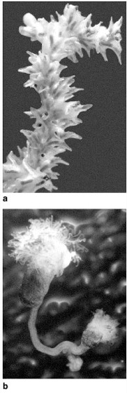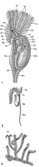 1 Bauplan von Cephalodiscus;2 Einzelindividuum von Cephalodiscus ohne Wohnröhre; 3 Ausschnitt aus einer Rhabdopleura-Kolonie, typisch die schuppige Ringelung der verzweigten Wohnröhren.