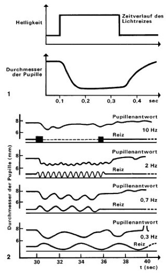 Die Pupille des menschlichen Auges hat bei starkem Lichteinfall einen kleinen, bei schwachem Lichteinfall einen großen Durchmesser. Dadurch trifft bei starker Beleuchtung ein kleinerer Teil des Lichts auf die Netzhaut als bei schwacher (vergleichbar der Blendenregulierung beim Photoapparat). 1 Bei einem plötzlichen Anstieg des Lichteinfalls (Sprungfunktion; Impuls [Abb.]) verengt sich die Pupille allmählich; bei Verminderung des Lichteinfalls wird sie allmählich weiter. 2 Fällt Licht in das Auge, dessen Intensität sinusförmig schwankt, so folgt die Pupillenreaktion bei sehr niedriger Reizlichtfrequenz der Intensitätsänderung mit einer gewissen Verzögerung. Je höher die Reizlichtfrequenz ist, desto schwächer wird die Pupillenreaktion, bis schließlich bei hoher Frequenz keinerlei Reaktion mehr zu erkennen ist.
