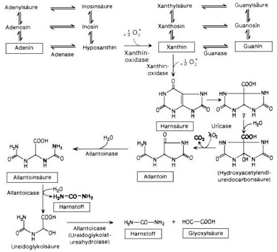 Purinabbau, die Folge von hydrolytischen und oxidativen Stoffwechselreaktionen, die ausgehend von den Purinnucleotiden, Purinnucleosiden bzw. Purinbasen über Hypoxanthin zu den Ausscheidungsprodukten (Exkretion) Harnsäure, Allantoin, Allantoinsäure, Harnstoff und Ammoniak führt ( vgl. Abb. ). Allerdings können nicht alle Organismen Purine (Purin) bis auf die Stufe des Harnstoffs abbauen. Zum Beispiel scheiden Primaten bereits die Harnsäure aus; ein weiterer Abbau unterbleibt (salvage pathway).