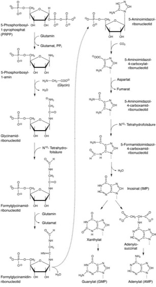 Purinnucleotidbiosynthesew, Abfolge von biochemischen Reaktionen, die zur Bildung der PurinnucleotideAdenin und Guanin führen ( vgl. Abb. ). Schrittmacherreaktion ist die Bildung von 5-Phosphoribosyl-1-amin aus PRPP (5-Phosphoribosyl-1-pyrophosphat) und Glutamin, die durch die Amidophosphoribosyl-Transferase katalysiert wird. In einer weiteren Reaktion wird unter ATP-Verbrauch Glycin an der freien Aminogruppe des Zuckers addiert. Die freie Aminogruppe des addierten Glycins wird anschließend, ebenfalls unter ATP-Verbrauch, durch N10-Formyl-Tetrahydrofolsäure (N10-Formyl-Tetrahydrofolat) formyliert und unter Glutaminverbrauch amidiert. Das entstandene Formylglycinamidribonucleotid wird unter Wasserabspaltung zum 5-Aminoimidazolribonucleotid cyclisiert, wodurch die Bildung des fünfgliedrigen Rings des Puringerüstes (Purin) abgeschlossen ist. Durch Carboxylierung und anschließende Addition von Aspartat am C4-Atom entsteht 5-Aminoimidazol-4-N-succinocarboxamid-ribonucleotid, das unter Eliminierung von Fumarat in 5-Aminoimidazol-4-carboxamid-ribonucleotid übergeht. Unter erneutem Verbrauch von N10-Formyl-Tetrahydrofolsäure wird die freie Aminogruppe des fünfgliedrigen Rings formyliert. In einer letzten Reaktion reagiert diese formylierte Molekülgruppe mit der freien Aminogruppe unter Wasserabspaltung, wodurch es zum Ringschluß (sechsgliedriger Ring des Puringerüstes) kommt. Produkt ist das Inosit (IMP, Inosin-5'-monophosphat), das in weiteren Reaktionen über Adenylosuccinat in Adenylat (AMP) oder über Xanthylat in Guanylat (GMP) umgewandelt werden kann.
