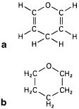 a Pyran, b hydrierte Form (Tetrahydropyran), das Grundgerüst der Pyranosen