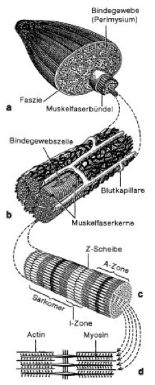 a Querschnitt durch einen Skelettmuskel;b mehrere Muskelfasern (dunkles Flechtwerk = Faserstrumpf aus Bindegewebsfäserchen); c Ausschnitt aus einer Myofibrille (Durchmesser ca. 1 μm); dMyofilamente
