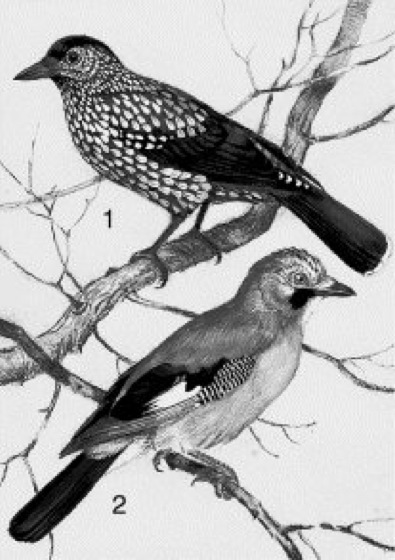 Tannenhäher (Nucifraga caryocatactes), 2 Eichelhäher (Garrulus glandarius)