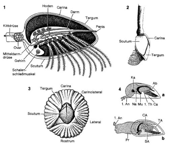 1 Bauplan eines Lepadomorphen (Entenmuscheln); 2Lepas anatifera (Entenmuschel); 3Balanus balanoides (Seepocke); 4 Umwandlung (schematisch) der Cypris-Larve (a) zur jungen Lepas(b).