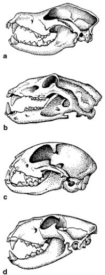 Schädel (nicht maßstabsgerecht) von a Hund, b Braunbär, c Hauskatze, d Löwe.