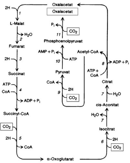 1 Malat-Dehydrogenase, 2 Fumarase (Fumarat-Hydratase), 3 Fumarat-Reductase, 4 Succinyl-CoA-Synthetase, 5 α-Oxoglutarat-Synthase (2-Oxoglutarat: Ferredoxin-Oxidoreductase), 6 Isocitrat-Dehydrogenase, 7 cis-Aconitase (Aconitat-Hydratase), 8 ATP-Citrat-Lyase, 9 Pyruvat-Synthase, 10 Phosphoenolpyruvat-Synthase, 11 Phosphoenolpyruvat-Carboxylase.