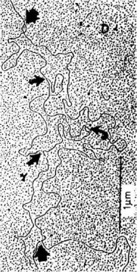 Abb. 1: Elektronenmikroskopisches Bild einer bidirektionalen DNA-Replikation. Die Replikation der meisten DNA-Moleküle ist bidirektional, d.h., sie verläuft von einem Startpunkt aus in beide Richtungen. Die DNA der Viren und der Bakterien besitzt nur einen einzigen Anfangspunkt für die Replikation. Dieser wird für eine zweite Replikationsrunde wiederbenutzt, bevor die erste Replikationsrunde ganz durchgelaufen ist. In der Abb. sind 3 laufende Replikationsrunden zu erkennen, die alle am selben Startpunkt begonnen haben, aber zeitlich versetzt, so daß sie verschieden weit fortgeschritten sind.