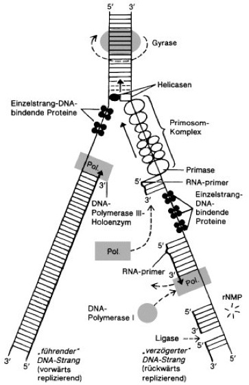 Abb. 2:Replikationsgabel (Modell für E.coli) mit der Vorwärts-Replikation des einen und der – stückweisen – Rückwärts-Replikation des anderen Tochterstrangs sowie Übersicht der an der DNA-Replikation beteiligten Enzymproteine und Reaktionsschritte. DNA-Stränge sind durch gerade, RNA-Stränge durch gewellte Linien dargestellt; die Windung der DNA-Helices ist daher nicht berücksichtigt. Nach der lokalen Entwindung der DNA am Replikationsursprung (Ori, ori) wird die Doppelhelix durch einzelstrangspezifische DNA-abhängige Helicasen weiter entwunden. Die weitere Stabilisierung erfolgt durch die kooperative Bindung des SSB-Proteins (Einzelstrang-Bindungsprotein, single strand binding protein; Abk. ssBP). Auftretende Torsionsspannungen werden von Topoisomerasen, bei E.coli von der Gyrase, aufgehoben. Die Pfeilspitzen kennzeichnen die arbeitenden DNA-Polymerase-III-Moleküle und weisen entsprechend der Syntheserichtung von 5' nach 3'. Am Leitstrang erfolgt eine kontinuierliche Synthese des neuen Strangs, am Folgestrang arbeitet die DNA-Polymerase III dagegen rückwärts und verlängert die 3'-Enden von RNA-primern. Die nach der Synthese durch DNA-Polymerase III (Pol.) verbleibenden Lücken des verzögert synthetisierten DNA-Strangs werden durch die langsamer arbeitende DNA-Polymerase I aufgefüllt, wobei gleichzeitig die RNA-primer durch die 5'-3'-Exonuclease-Aktivität von DNA-Polymerase bzw. durch eine RNA-DNA-Hybrid-spezifische RNase (sog. RNase H) unter Bildung von Ribonucleosidmonophosphaten (rNMP) abgebaut werden. Die aufgrund dieser Reaktionen jetzt nahtlos nebeneinander passenden, jedoch noch durch 3 Strangbrüche getrennten DNA-Ketten werden in einem letzten Schritt durch DNA-Ligase kovalent zu einem durchgehenden Tochterstrang verbunden. Der aus zahlreichen Proteinen zusammengesetzte Komplex des Primosoms bewegt sich, der Replikationsgabel folgend, unter Energieverbrauch (ATP-Hydrolyse) entlang dem template-Strang der verzögert synthetisierten DNA in 5'-3'-Richtung. In Abständen von ca. 1000 Nucleotidpositionen synthetisiert die im Primosom enthaltene Primase die kurzkettigen RNA-primer. Die Richtung dieser RNA-Synthesen ist 5'-3' bezüglich der RNA-Produkte, jedoch 3'-5' bezüglich der template-DNA. Die Bewegung des Primosoms ist daher während der kurzen Synthesephasen zumindest für die Primase-Komponente rückläufig. Die durch Helicase katalysierte Entspiralisierung der beiden DNA-Stränge an der Replikationsgabel führt zu einer Zunahme der superhelikalen Verdrillung im noch nicht replizierten (oberen) Teil der DNA. Dieser sog. superhelikale Twist würde die weitere Entspiralisierung und damit die Replikation blockieren. Er wird jedoch durch die Wirkung von Gyrase (DNA-Topoisomerasen) laufend entspannt.