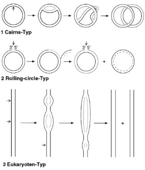 Aufgrund unterschiedlicher Strukturen, die während der DNA-Replikation verschiedener Organismen beobachtet werden, unterscheidet man im allgemeinen folgende Replikationstypen (kurze Pfeile zeigen Replikationsstartpunkte an). 1Cairns-Typ oder Theta-Typ: innerhalb doppelsträngiger ringförmig geschlossener DNA bewegen sich, von einem Replikationsursprung ausgehend, 2 Y-förmige Replikationsgabeln voneinander weg (Beispiel: E. coli). 2Rolling-circle-Typ oder Sigma-Typ: ein einzelsträngiges ringförmig geschlossenes DNA-Genom wird zunächst in ein doppelsträngiges Molekül umgewandelt. Von dieser replikativen Form (RF-Form) ausgehend wird nach dem rolling-circle-Prinzip das Genom repliziert (Beispiel: einzelsträngige DNA-Phagen, z.B. ΦX174). 3Eukaryoten-Typ: von zahlreichen Replikationsstartpunkten ausgehend, wandern je 2 Replikationsgabeln in entgegengesetzter Richtung auseinander.