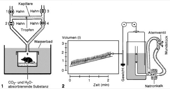 2Spirometer messen veränderte Gasvolumina bei konstantem Druck in einem geschlossenen System. Durch den O2-Verbrauch aus der Tauchglocke bei gleichzeitiger Absorption des CO2 an Natronkalk (Atemkalk) sinkt die Glocke zum Wasserspiegel hin. Die einzelnen Atemzüge können mit einem Schreiber registriert werden. Ihre Auswertung mittels einer an die Kurven gelegten Tangente ergibt den O2-Verbrauch pro Zeiteinheit.