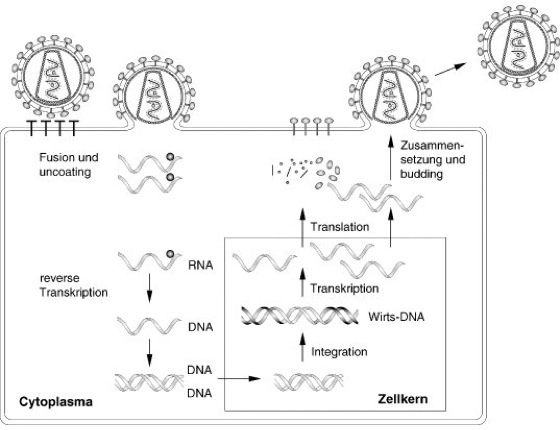 Abb. 1: Der Replikationszyklus von Retroviren am Beispiel des humanen Immundefizienz-Virus (HIV) in stark vereinfachter Darstellung. Nach Fusion der Virushülle mit der Wirtszellmembran und der teilweisen Auflösung des Capsids (uncoating) wird von einem der beiden RNA-Genome mit Hilfe des Enzyms reverse Transkriptase eine einzelsträngige DNA-Kopie hergestellt (reverse Transkription). Nach Umwandlung in eine doppelsträngige DNA wird diese in den Kern transportiert und dort in die Wirts-DNA integriert (Integration). Das Provirus kann lange Zeit latent bleiben, ehe es aktiviert wird und die Virusbildung (Transkription, Translation, Zusammensetzung und budding) beginnt.