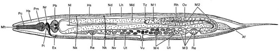 Rhabditis (Caenorhabditis) elegans, selbstbefruchtender Hermaphrodit, halbschematisch, Ansicht von links. Af After, Ex Exkretionsporus, Hs Hautmuskelschlauch (Cuticula + Hypodermis + Längsmuskulatur), Lh Leibeshöhle (Pseudocoel, da ohne Coelomepithel), Md Mitteldarm, Mh Mundhöhle, M1 Mitosen (Zellproliferation), M2 Meiose (Prophase 1), M3 Besamung, Abschluß der Meiose, Befruchtung, M4 Furchung, Nd, Nv dorsaler bzw. ventraler Nerv, Nk, Nl Nervenkommissuren bzw. lateraler Nerv (nur im 2. Körperfünftel gezeichnet), Nr Nervenring („Gehirn“, von dort Nerven zu den Kopfsinnesorganen), Ov Ovar (regelmäßig das vordere rechts, das hintere links vom Darm), Pb Pharynx-Bulbus mit Klappenapparat, Pc Pharynx-Corpus, Pi Pharynx-Isthmus, Pm Pharynx-Metacorpus, Re Receptaculum, Rh Rhachis, Tz Terminalzelle (distal tip cell, verantwortlich für die mitotische Proliferation), Ut Uterus mit Eiern, Vu Vulva