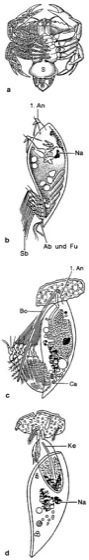 Strandkrabbe (Carcinus maenas), infiziert mit dem Sackkrebs Sacculina carcini (von ventral); rechte Seite wie durchsichtig gezeichnet, zeigt die Sacculina interna (S = Sacculina externa); b freischwimmende Cypris-Larve; c frisch festgesetzte Cypris-Larve, die Thorax und Extremitäten abwirft; d Umwandlung zum Kentrogon. Ab Abdomen, An Antenne, Bo Borste des Wirtskrebses, Ca Carapax, Fu Furca, Ke Kentron, Na Naupliusauge, Sb Schwimmbeine