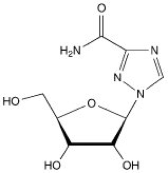 Ribavirins, Virazol, als Antimetabolit wirkendes Virostatikum ( vgl. Abb. ), ein Analogon zu dem natürlich vorkommenden Ribonucleosid Guanosin; wird vor allem zur Behandlung schwerer Infektionen der unteren Atemwege, die durch das Respiratory Syncytial Virus (RSV) hervorgerufen werden, verwendet. Das breite Wirkspektrum umfaßt neben Herpesviren, Adenoviren, Arenaviren (Lassa-Fieber), Bunyaviren, Reoviren, Influenzaviren und RSV (Paramyxoviren) und anderen auch HIV (AIDS). Wie DDC und DDI (Dideoxyinosin) wird Ribavirin intrazellulär in seinen aktiven Metaboliten umgewandelt, der verschiedene Virusenzyme (u.a. die RNA-Polymerase) hemmt und durch Veränderung des mRNA-Cappings die Translation stört.