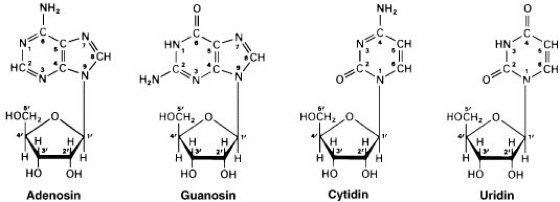 Struktur der 4 Standard-Ribonucleoside: Adenosin, Guanosin, Cytidin, Uridin