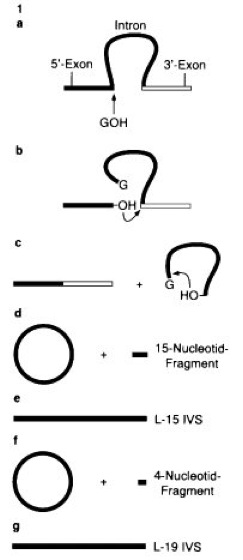 1 Das 26S-rRNA-Vorläufermolekül aus Tetrahymena kann ohne Unterstützung von Proteinen sein Intron herausschneiden und die beiden Exonen wieder miteinander verbinden. Die Aktivität des sich selbst prozessierenden RNA-Moleküls hat, da es nicht unverändert aus dem Reaktionsablauf hervorgeht, lediglich Enzym-ähnlichen Charakter.